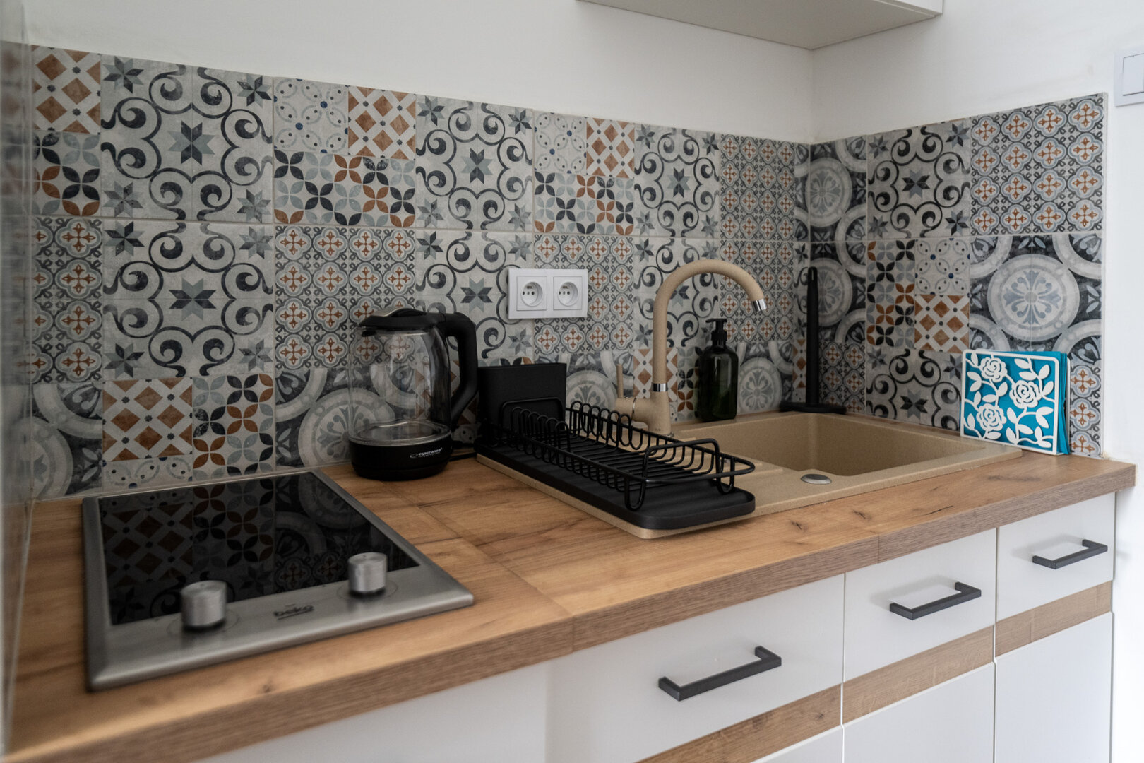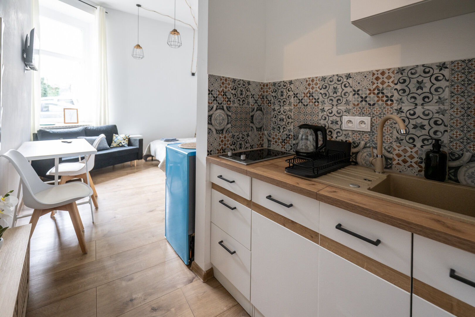 Jasne studio inspirowane latem: turkusowa lodówka, kolorowe płytki i lekkie tkaniny tworzą wakacyjny klimat w centrum miasta. Wygodne łóżko małżeńskie i rozkładana sofa pomieszczą do 4 osób. Aneks kuchenny, szybkie Wi-Fi oraz Smart TV z Netflixem sprzyjają relaksowi po dniu zwiedzania. Blisko komunikacja miejska, restauracje i parki – idealne na letni city break lub dłuższy pobyt.