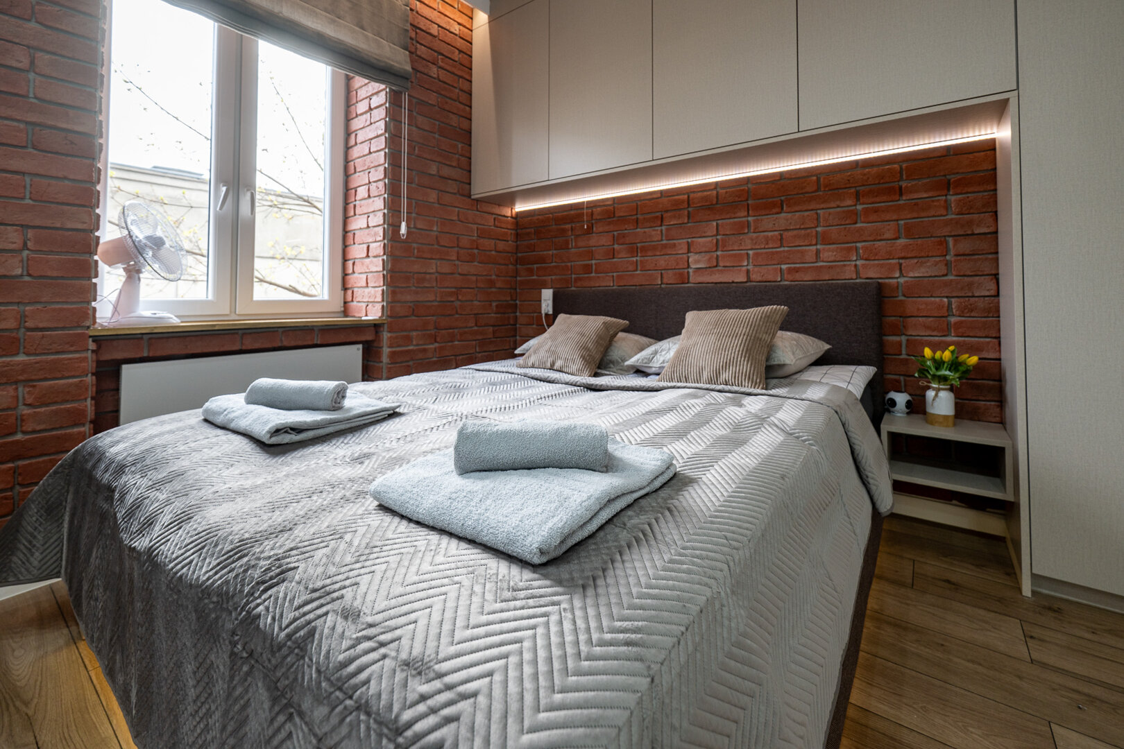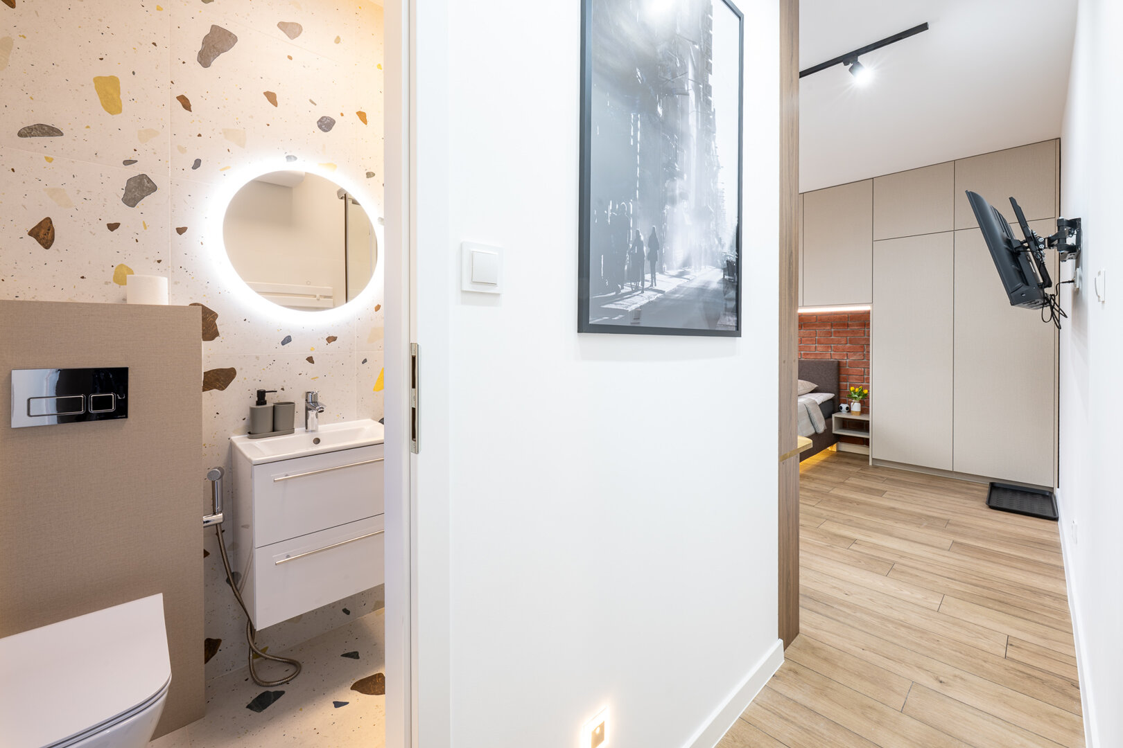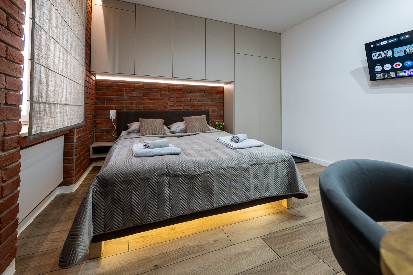 Zatrzymaj się w miejscu, w którym naprawdę czuć ducha Łodzi. To kameralne studio w pofabrycznym kompleksie przy Targowej 75 łączy loftowy charakter z nowoczesnym komfortem. Ceglane ściany, ciepłe drewno i nastrojowe światło tworzą wyjątkowy klimat. Wieczorem apartament pokazuje swoje najlepsze oblicze — LED-y i podświetlane łóżko budują atmosferę, do której chce się wracać po dniu pełnym miejskich wrażeń, by odpocząć, zwolnić i po prostu pobyć.