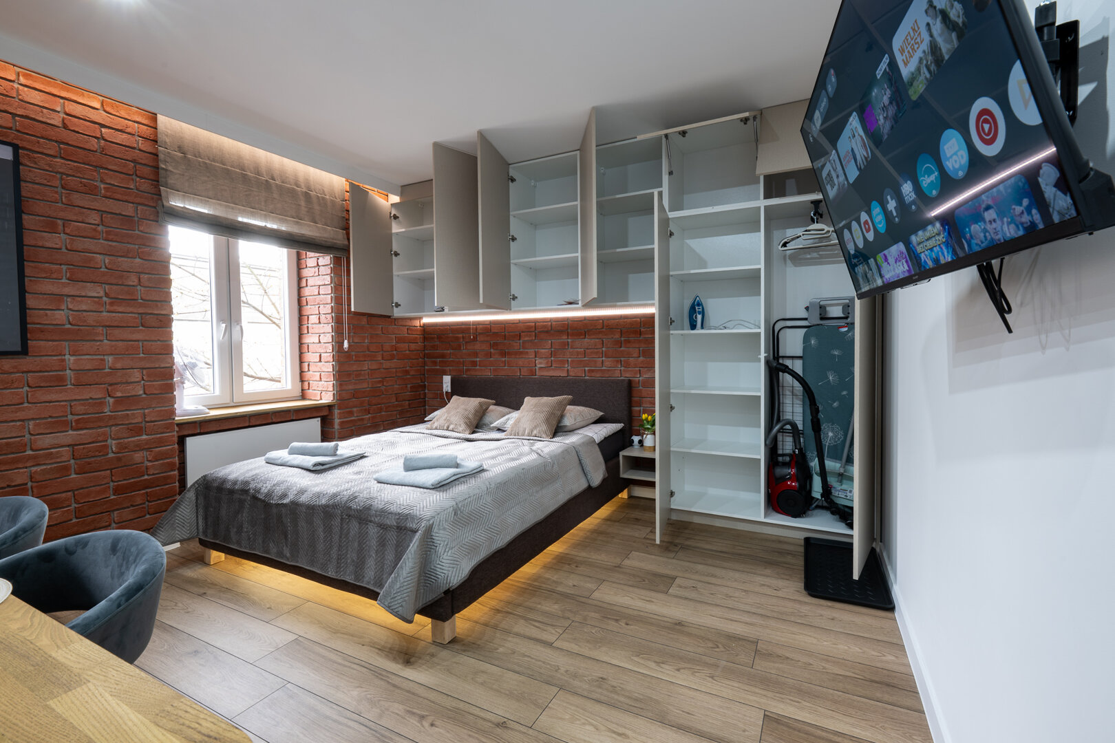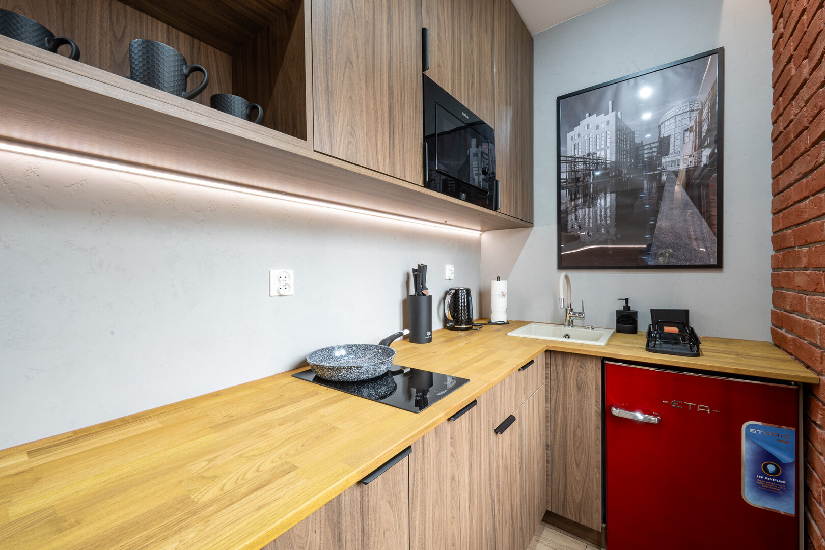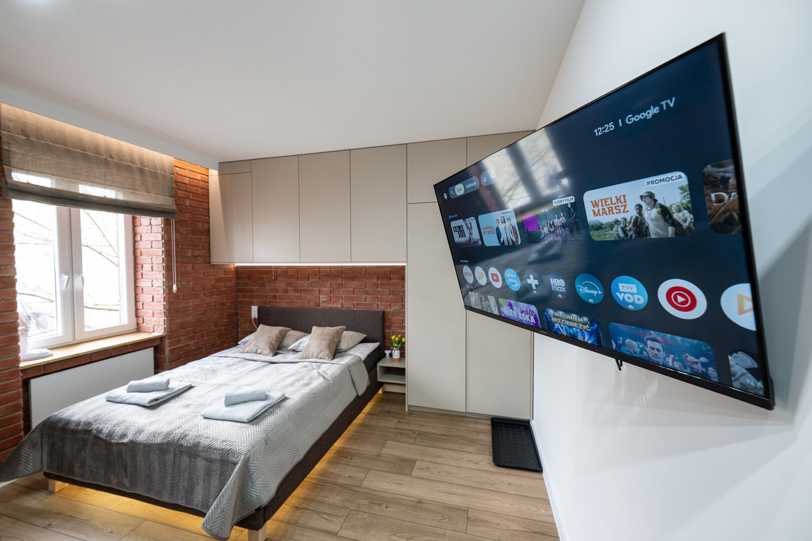 Zatrzymaj się w miejscu, w którym naprawdę czuć ducha Łodzi. To kameralne studio w pofabrycznym kompleksie przy Targowej 75 łączy loftowy charakter z nowoczesnym komfortem. Ceglane ściany, ciepłe drewno i nastrojowe światło tworzą wyjątkowy klimat. Wieczorem apartament pokazuje swoje najlepsze oblicze — LED-y i podświetlane łóżko budują atmosferę, do której chce się wracać po dniu pełnym miejskich wrażeń, by odpocząć, zwolnić i po prostu pobyć.